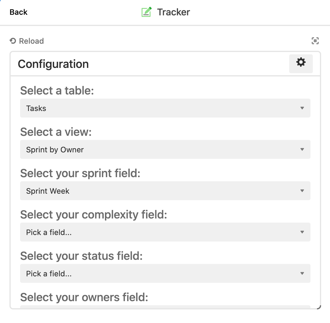 Because different teams customize their views, the app allows you to select the fields that represent concepts like "owner" and "complexity" instead of enforcing a particular naming scheme.