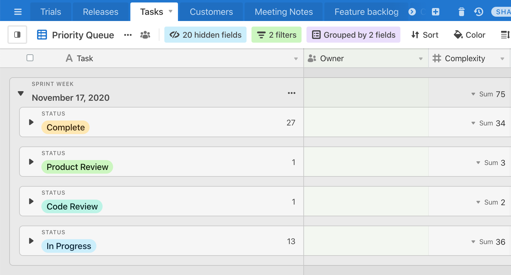 While Airtable has good grouping and summarization already, it was difficult to see an overview of allocated tasks and points across upcoming sprints. So the first place to start was adding a roll-up by person.